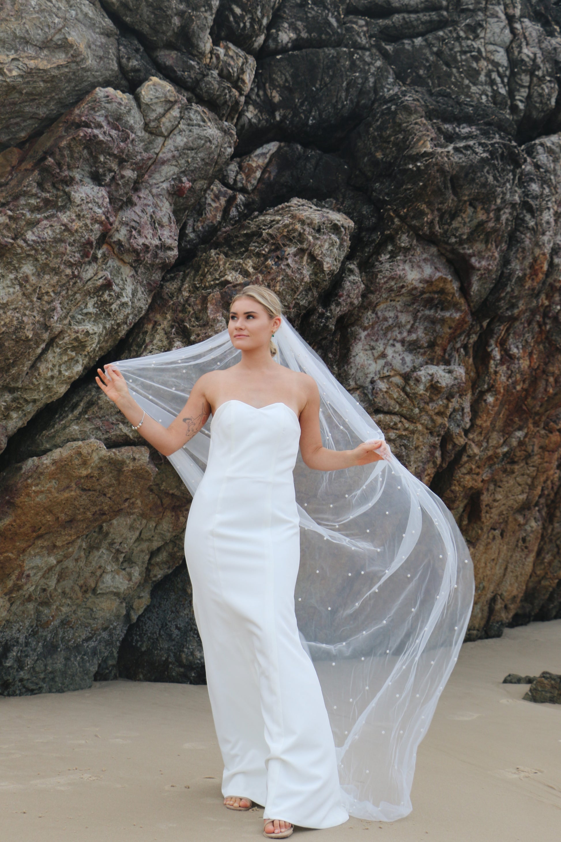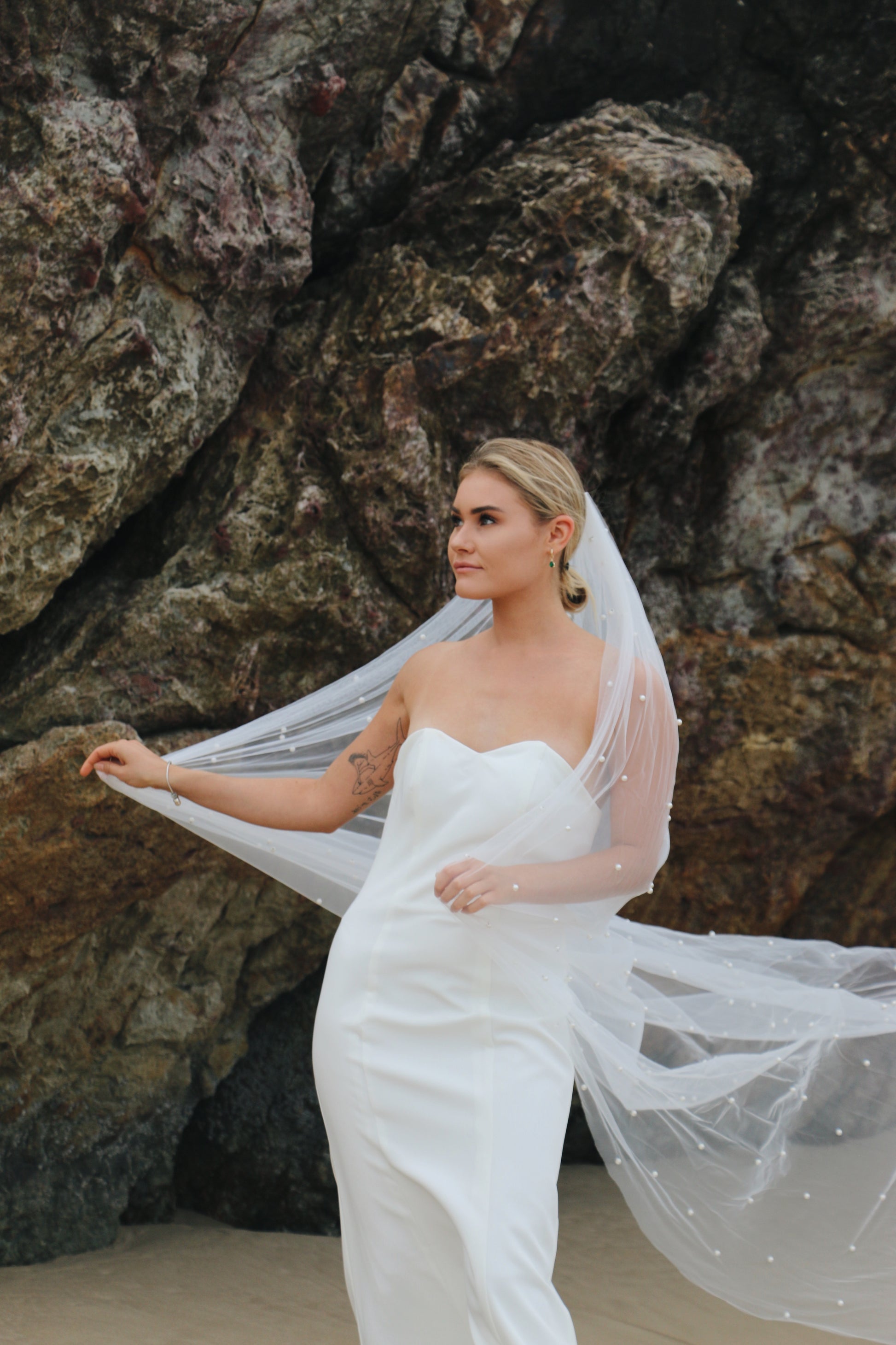 Our Pearl Veil is a single-layer, 1.6m length masterpiece adorned with exquisite pearl detailing and a convenient comb for easy placement.