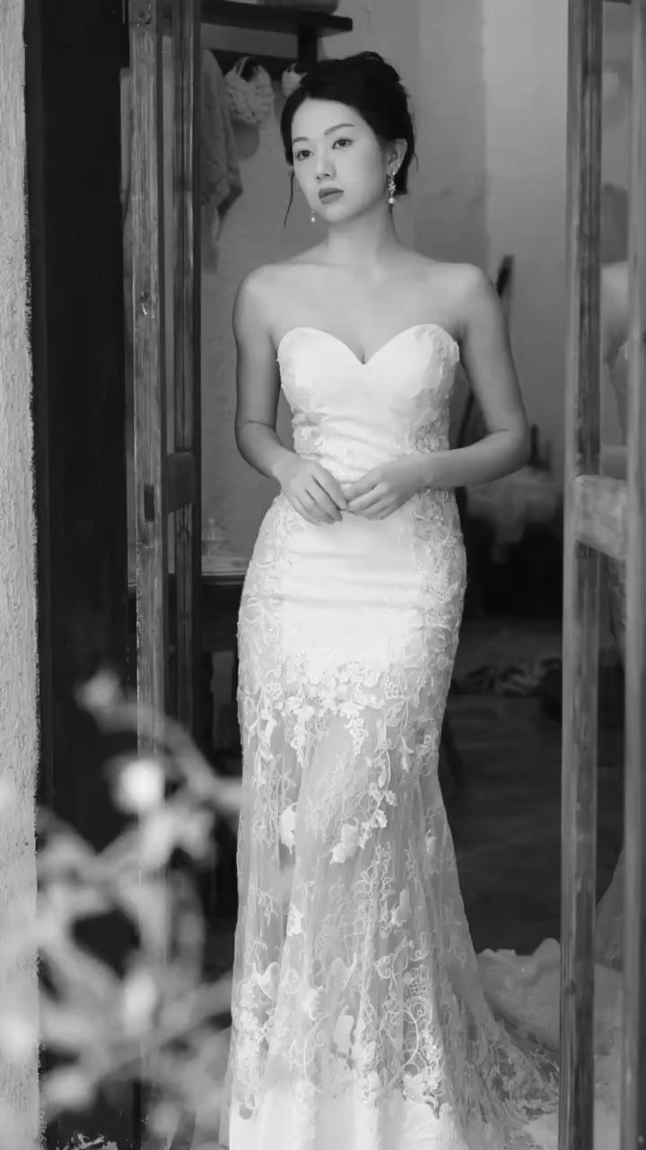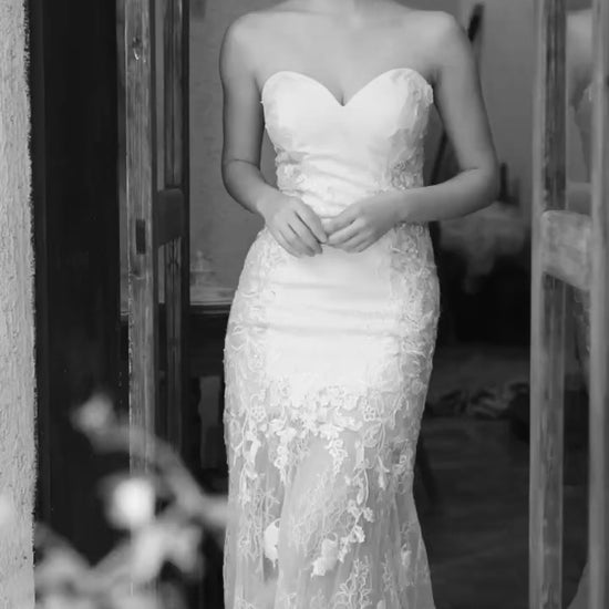 The fitted silhouette flows into a dreamy, lace-trimmed train, creating a captivating balance of structure and softness.
