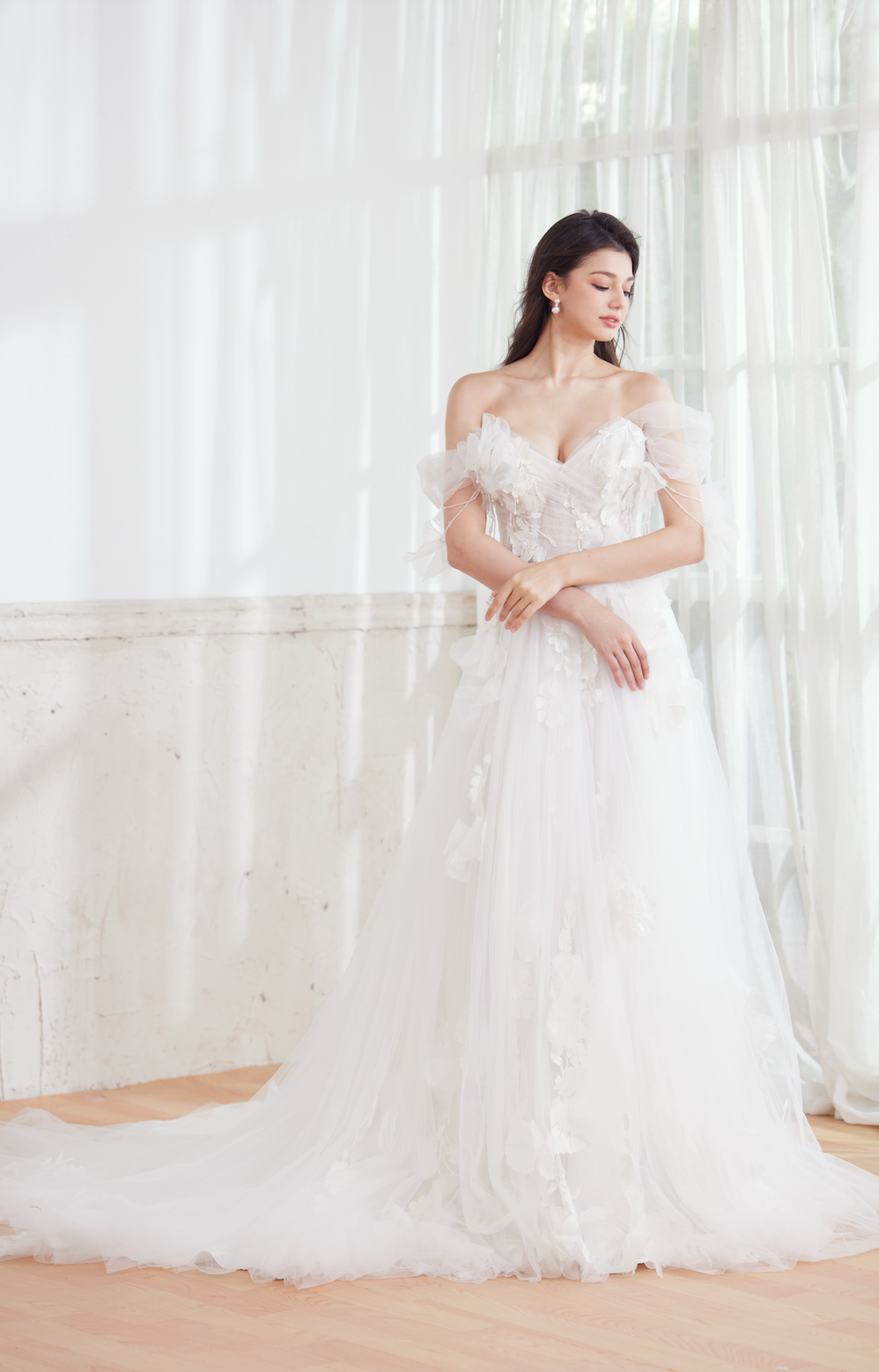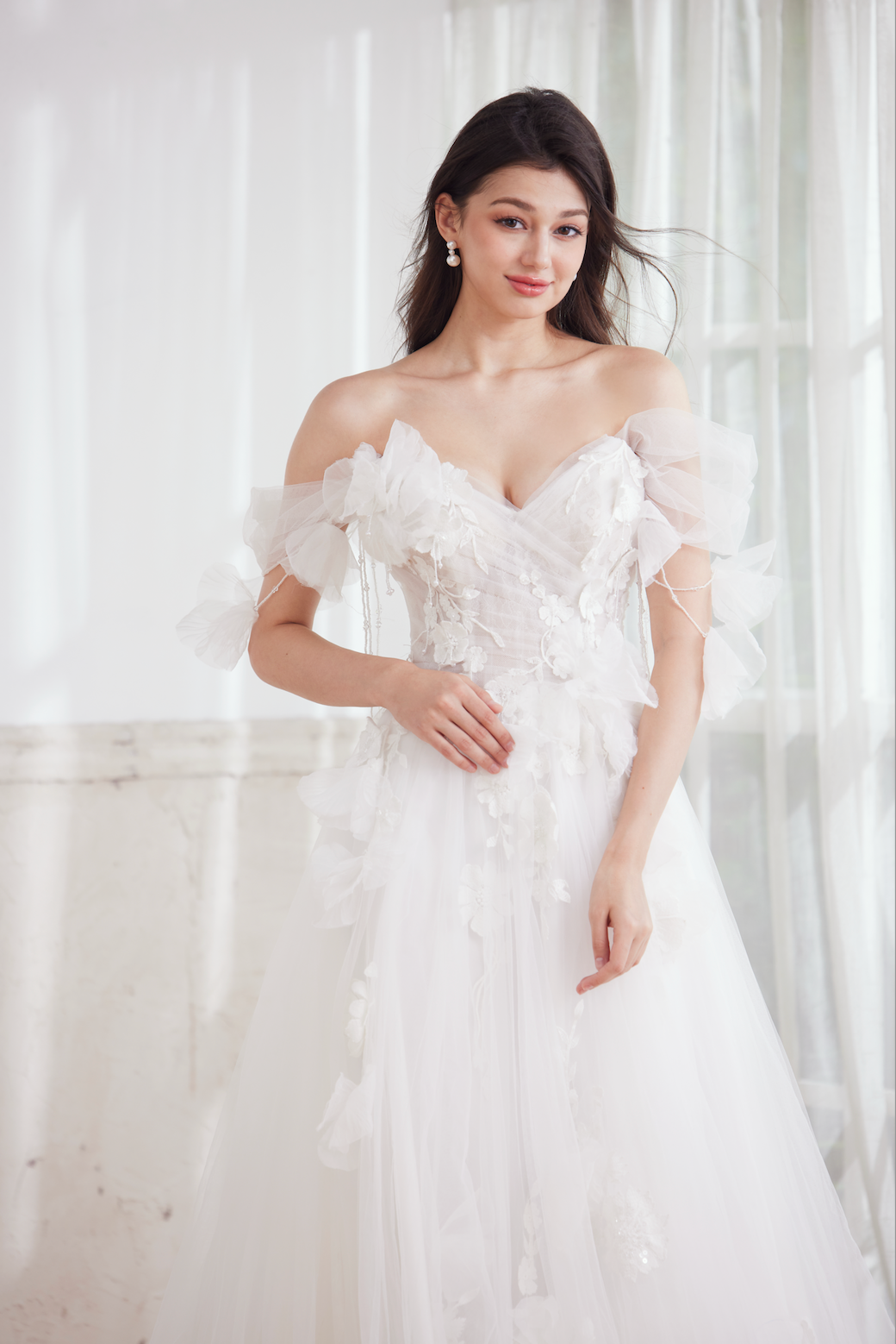 Delicate 3D floral motifs are carefully placed throughout, adding depth and dimension, as if fresh flowers were gently floating on the gown itself.
