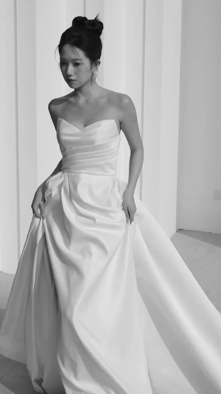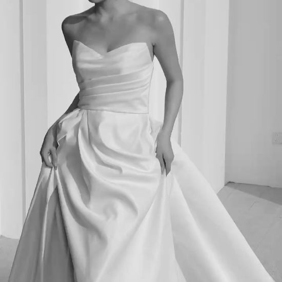 The Vinessa Dress embodies sleek sophistication with a chic sweetheart neckline. Thoughtful pleating flows from the bust down to the dress's high split, creating a seamless and elegant silhouette. This dress perfectly balances class and allure, making it an ideal choice for brides who appreciate a playful yet classic style for a memorable occasion.