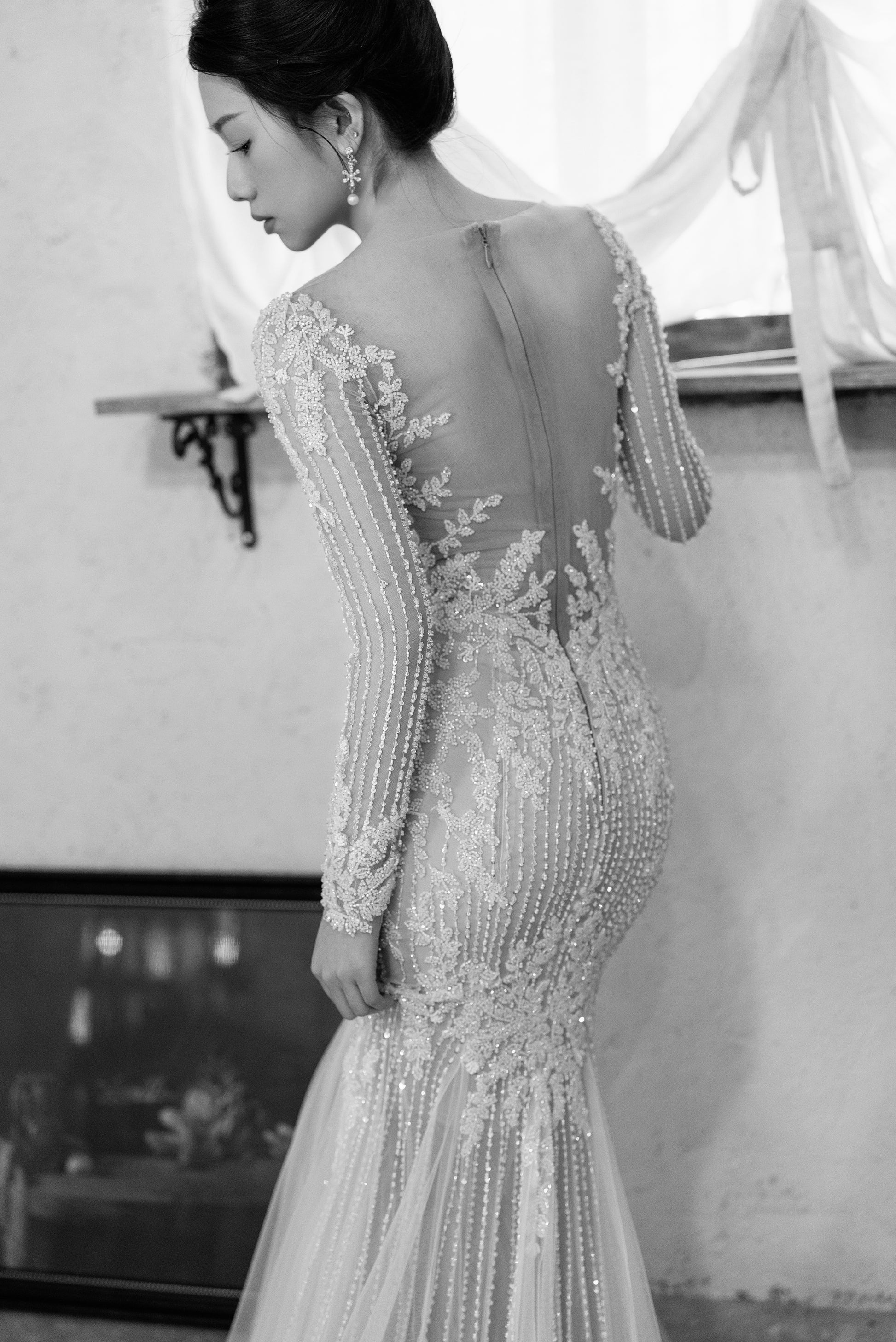 Graceful, radiant, and undeniably enchanting, the Vespera gown embodies celestial beauty. This sleek mermaid silhouette is adorned with intricate lace appliqués over sheer illusion tulle, creating a breathtakingly delicate effect. The beaded long sleeves and plunging neckline add a touch of glamour, while the flowing tulle train completes the look with effortless elegance.